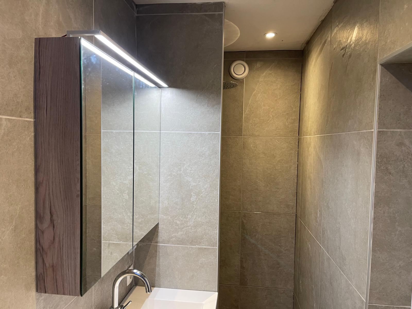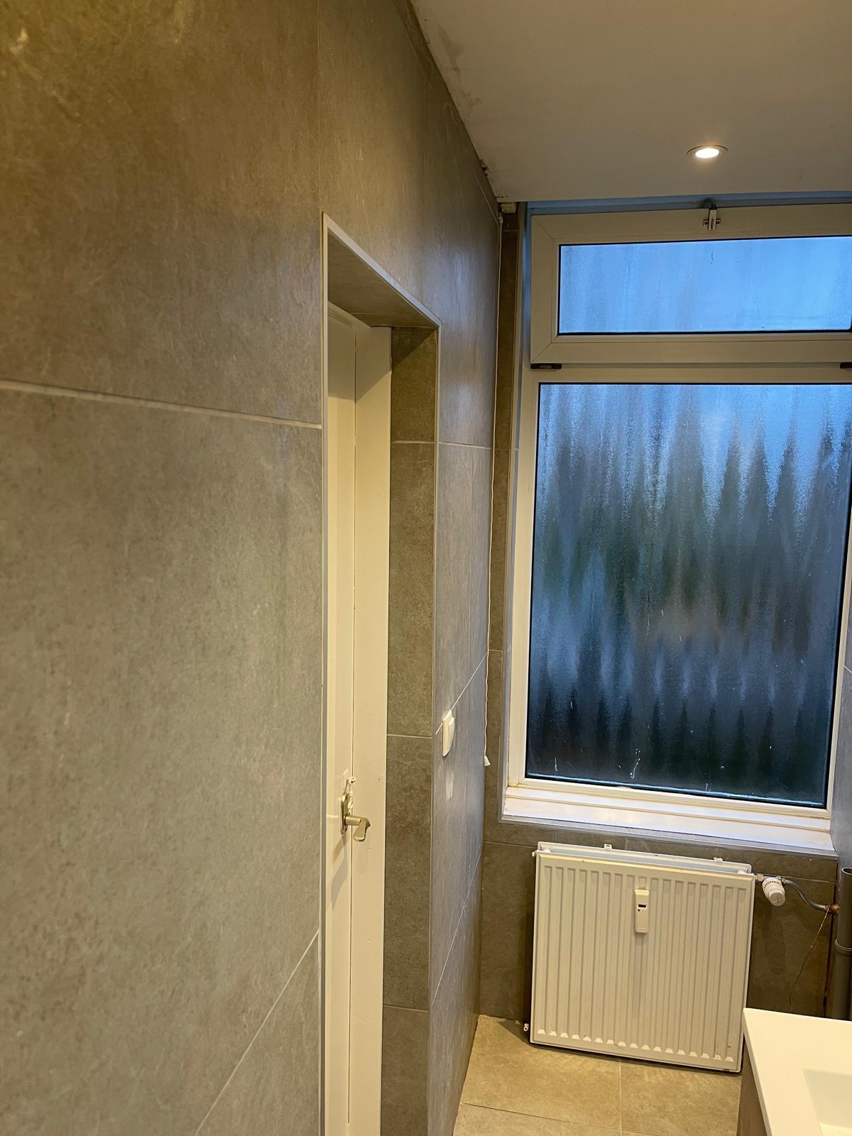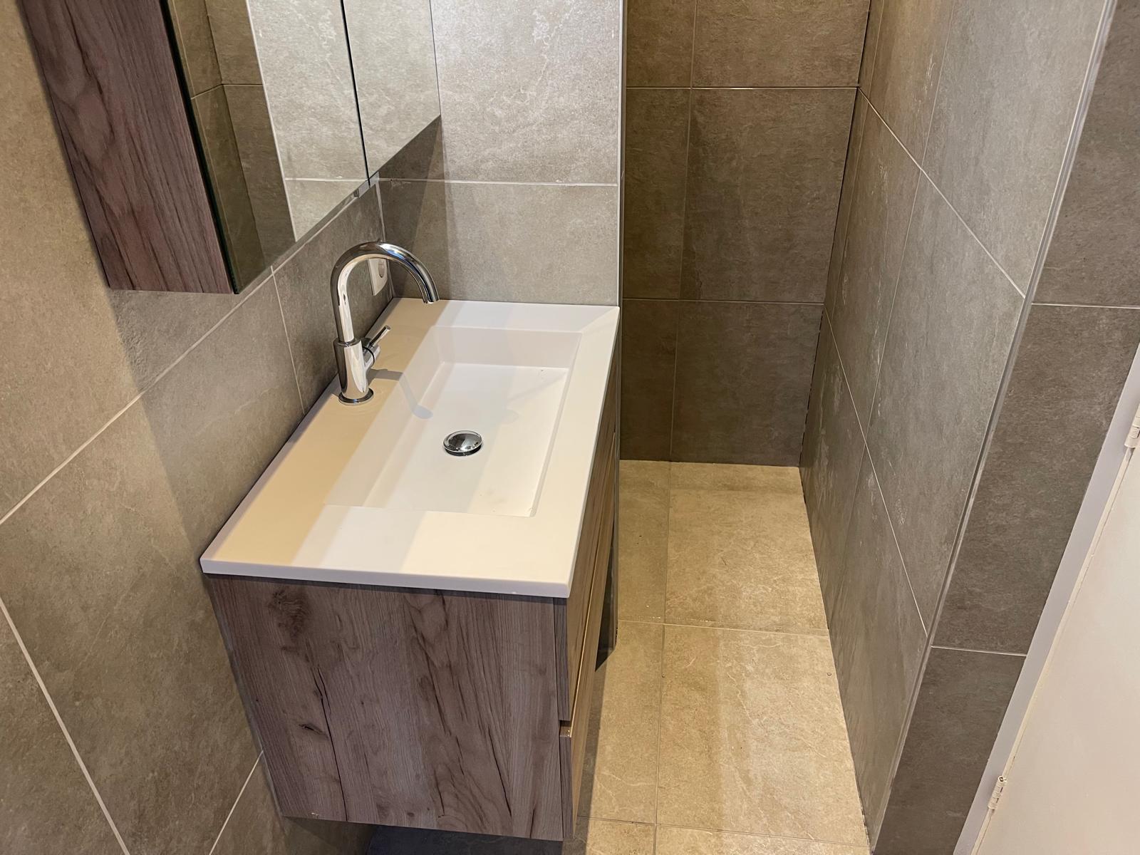 Voor de badkamer brachten we eerst een nieuwe dekvloer aan om een stevige basis te creëren. Vervolgens voorzagen we de ruimte van nieuwe leidingen voor aan- en afvoer en vervingen we het elektrische systeem. Dit garandeert veilige aansluitingen voor verlichting en elektrische apparaten. Daarna werden de wanden en vloer betegeld met stijlvolle tegels die een moderne uitstraling gaven. Als laatste stap hebben we de nieuwe sanitaire voorzieningen en meubels geïnstalleerd en afgewerkt.