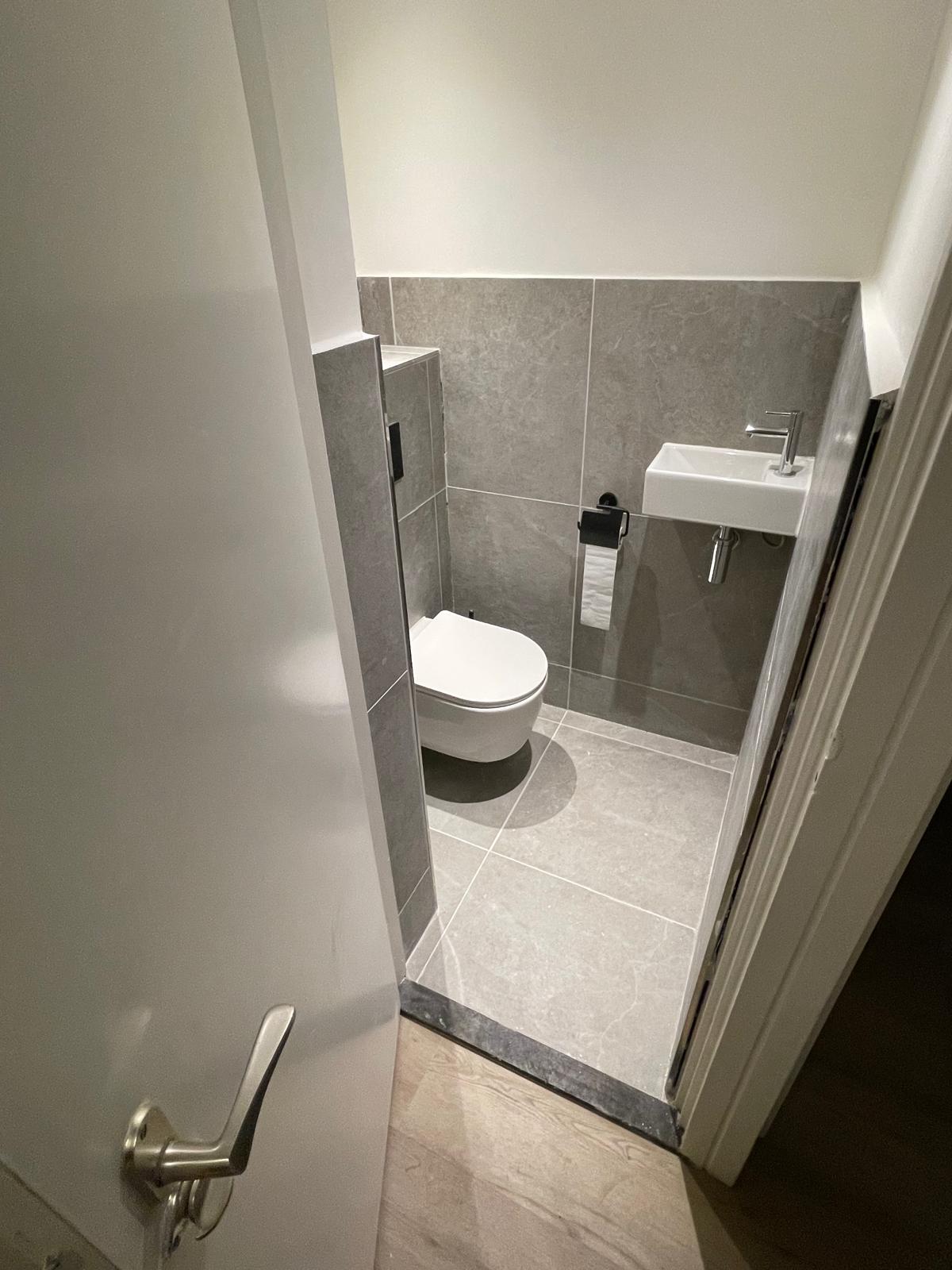 In het toilet hebben we een ombouw en voorzetwand gemaakt voor de nieuwe wateraansluiting. Net als in de badkamer werden de leidingen vervangen, de elektra vernieuwd en de ruimte betegeld. Na de montage van het toilet en de afwerking is ook deze ruimte compleet vernieuwd.